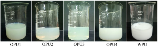 The molecular weight of OPUs was investigated by GPC, as shown in Table 1. It is evident that the number-averaged molecular weight (Mn) of OPUs is in the range of 15,960–19,444 g/mol. The polydispersity index (PDI) is about 1.76–2.62, indicating a relatively narrow molecular weight distribution. In addition, the molecular weight of OPU1 prepared with BINOL is lower than OPU3 and WPU, and this is probably because the reactivity of phenolic hydroxyl groups in BINOL is relatively lower than that of alcoholic hydroxyl groups in BDO.