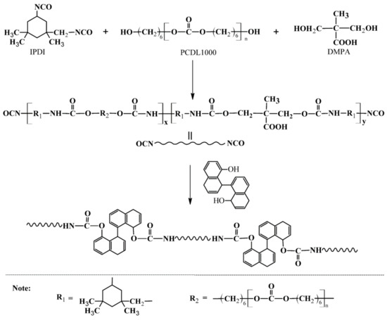 Isophorone diisocyanate (IPDI), 1,1′-Binaphthalene-2,2′-diol (BINOL), and 2,2-Dimethylol propionic acid (DMPA) were purchased from Aladdin Co., Ltd. (Shanghai, China). Polycarbonate diol 1000 (PCDL1000) was available from Jining Huakai Resin Co., Ltd. (Jining, China) and was vacuum dried at 60 °C for about 24 h prior to use. In addition, 1,4-Butanediol (BDO) and triethylamine (TEA) were procured from Sinopharm Chemical Reagent Co., Ltd. (Shanghai, China). Anhydrous tetrahydrofuran (THF) was bought from Sinopharm Chemical Reagent Co., Ltd. and always kept with 4A molecular sieve before use.