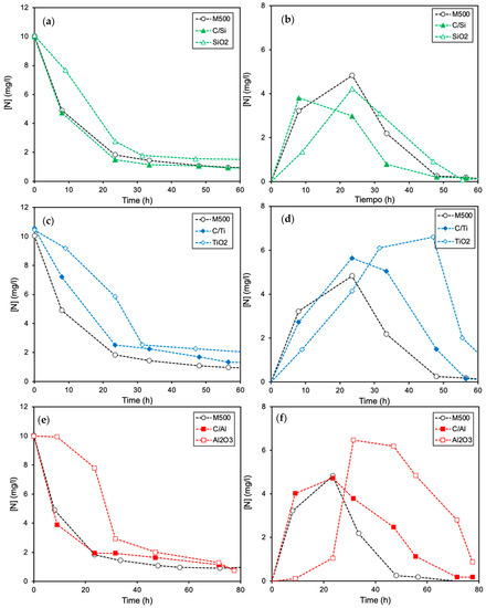 The performance of the biofilms supported on the composites regarding their pure phases is compared in Figure 2. As with the case of pure phases, both nitrates and intermediate nitrites are completely removed regardless the material tested, but bacteria supported on the carbon–metal composites present an intermediate performance between the pure carbon and the corresponding metal oxide phase. The reduction processes are progressively slower for composites containing C/SiO2, followed by C/TiO2 and finally, C/Al2O3. Thus, the bacterial activity follows the same tendency previously observed by using pure metal oxides (Figure 1). The concentration of intermediate NO2− typically decreases after total NO3− reduction is achieved (Figure 2b), indicating a preferential reduction for the NO3− species.