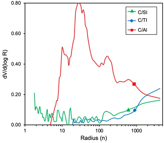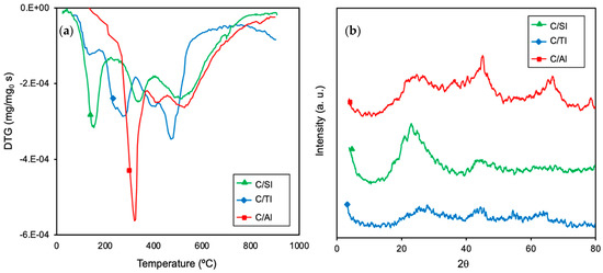 Concerning the acidity of the supports, it is noteworthy that the pHpzc of the composites increased regarding the corresponding pure oxides (Table 3 vs. Table 2). This acidity decrease is due to the chemical transformations underwent by both organic and inorganic phases of the samples during the carbonization. The acidic chemical groups are evolved as gases (i.e., COx, H2O) according to their thermal stability and the interactions between the metallic phase and the organic matrix. The carbonization process was simulated by thermogravimetric analysis (TG/DTG) and the results are shown in Figure 5a. The DTG profile obtained for the carbonization of pure organic polymers (result not shown for clarity) presents three main peaks centered at around 200 °C, 350 °C and 550 °C, associated with the loss of unreacted products, the breakage of C−O and finally, the reorganization of C−C and C−H bonds [37,38]. The temperature of these DTG peaks in the composites significantly changes between them, indicating different organic polymer–oxide precursor linkages. The marked DTG peaks located at around 320 °C for C/Al2O3 are worth noting, which could suggest a larger loss of oxygenated surface groups. All composites do not present any significant weight loss from 800 °C, indicating that the main transformations occur at lower temperatures. The intimal interaction between carbon and oxide fractions was also pointed out by X-ray diffraction (XRD) (Figure 5b), with no diffraction peaks being observed that denote the presence of crystalline phases corresponding to the metallic phases, except a small peak at 44.5° in sample C/Al2O3 that indicates the incipient crystallization of Al2O3. In other words, the organic phase prevents the crystalline growth of the inorganic phases, even after heat treatment.
