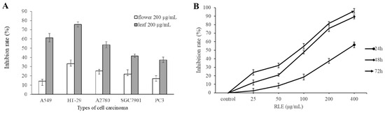 (A) Inhibitory effect of RFE and RLE on the growth of five cancer cells at 200 μg/mL for 48 h (`x ± SD, n = 3); (B) Inhibitory effect of RLE on HT-29 cells (`x ± SD, n = 3).