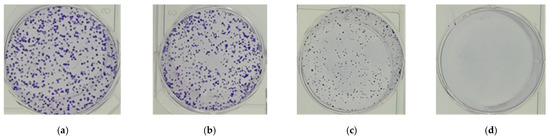 (a) Control; (b) 50 μg/mL; (c) 100 μg/mL; (d) 200 μg/mL. The effect of RLE on the colony formation rate of HT-29 cells.