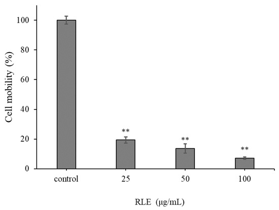 HT-29 cells were treated with different concentrations of RLE to detect the effect on cell migration. The results are demonstrated in Figure 3. For RLE treatment, HT-29 cells exhibited decreased migration compared to those in the control group. In addition, the migration rate decreased with the increase of RLE concentration. When the concentration reached 100 μg/mL, the migration rate of HT-29 cells was only 7.15% of that of the control group (Figure 4). The results suggested that RLE could obviously inhibit the migration of cells.