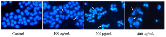 The cells of the logarithmic growth phase were maintained in the 24-well plate at a density of 2 × 104/well for 24 h. The medium was replaced with a complete medium 200 μL, containing RLE 400, 200, 100, 0 μg/mL, and the control group was provided with an equal amount of DMSO (0.1%) complete medium. They were incubated for 24 h in the incubator at 37 °C, 5% CO2. The liquid in the plate was removed using a pipette and the cells were washed with PBS twice. DAPI staining solution was added and they were incubated for 20 min at room temperature, avoiding light. They were then observed under a fluorescence microscope.
