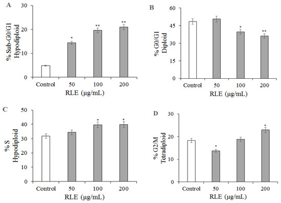 HT-29 cells were treated with different concentrations of RLE, fixed with 70% ethanol, stained with PI, and cell cycle was detected by flow cytometry. (A–D) The percentages of cells in each phase are plotted along the y-axis and the different treatments are graphed along the x-axis. (`x ± SD, n = 3). * p < 0.05 ** p < 0.01 vs. control group.