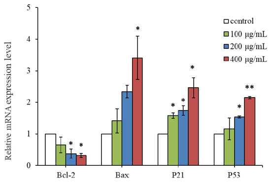 In order to further illuminate the potential anti-cancer mechanism of RLE, qRT-PCR analysis was used to detect the gene expression level of Bax, Bcl-2, P21, and P53 genes in HT-29 cells (Figure 8). Compared with the control group, RLE would downregulate the expression level of Bcl-2 in HT-29 cells with dose dependence. When the cells were treated with 200 μg/mL RLE, the gene expression level of Bcl-2 was only 0.37 times that of the control group. By contrast, RLE would upregulate the expression level of Bax, P21, and P53 in HT-29 cells with dose dependence. When the cells were treated with 200 μg/mL RLE, the expression of Bax, P53, and P21 genes was upregulated by 2.33, 1.73, and 1.53 times respectively.