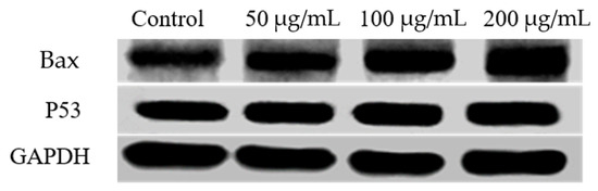 Since the corresponding genes of Bax and P53 would be significantly upregulated in the RLE treatment group, Bax and P53 were selected for further western blotting analysis. HT-29 cells were firstly treated with 200, 100, 50, and 0 μg/mL concentration RLE for 48 h. Western blot results, depicted in Figure 9, showed that the expression level of Bax protein was significantly increased and the expression of P53 was also enhanced in the HT-29 cells treated with RLE, compared with the control group. Moreover, with the increase in the concentration, the expression difference was more and more significantly in a concentration-dependent upregulation, which was basically consistent with the results of qRT-PCR.