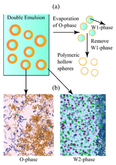 Emulsion microencapsulation is a technique to prepare hollow polymer microspheres with W1/O/W2 double emulsion. The emulsion is generated by dispersing the oil phase (O phase), which contains polymer macromolecules, and wraps the inner water phase (W1 phase) over the outer water phase (W2 phase). Hollow polymer microspheres can be obtained by curing the emulsion and removing the O phase solvent and the W1 phase. Hollow polymer microspheres are important polymer materials with an internal cavity, which can encapsulate various types of matter. An illustration of the W/O/W structure and the hollow sphere preparation process is shown in Figure 1a. In the fields of medicine and biology, Hollow polymer microspheres are widely used to encapsulate drugs to achieve long-distance macromolecule delivery and controlled release [1,2]. Due to the high refractive index difference between the spherical shell of hollow polymer microspheres and air, the spheres have a strong light-shielding ability and can be used in paint coatings in construction and leather, as well as in the cosmetics and paper industry [1,3,4]. In the energy field, hollow polymer microspheres can wrap phase change materials to prepare phase change microcapsules [5].