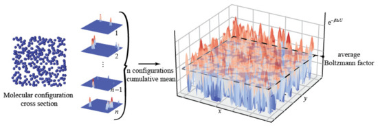 where μid (ρ) is the chemical potential of an ideal gas with a density ρ, which can be calculated by thermodynamics. The core manipulation of this method is to insert a test particle into a system of N particles, which increases the particle number of the system from N to N + 1 and changes the internal energy of the system by ΔU. The denotation ⟨…⟩N refers to the average of a physical quantity in an N-particle canonical ensemble. When calculating μex with Equation (2), test particle insertions were attempted over all positions of the internal space of the system, and the ensemble average, ⟨e(−βΔU)⟩N, was integrated. As shown in Figure 2, test particles were randomly inserted on the cross-sections of multiple molecular configurations in a canonical ensemble, and the Boltzmann factor, e(−βΔU), at the insertion positions was calculated, and then averaged for all configurations, which led to the integration of ⟨e(−βΔU)⟩N in Equation (2).