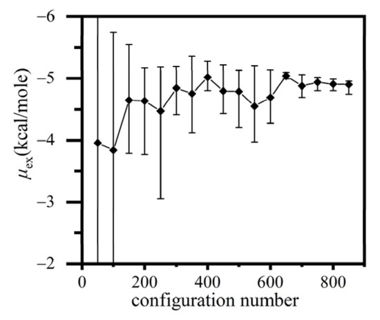 The excess chemical potential of fluorobenzene, as a common solvent in emulsion microencapsulation processes, was calculated with the verified two-level detailed average Widom method. The drawback to applying the conventional Widom method for this type of molecules was that the calculation usually underestimated e−βΔU because the proper insertion patterns in a grid were rare and, hence, could be very likely missed when the probe molecule was randomly rotated at the grid center. In the present detailed average method, the insertion pattern of A-particles was fully scanned inside the grid by performing uniform translations and rotations. The fluorobenzene liquid system consisted of 12,000 atoms, and all the configurations for Widom insertion were meshed as 50 × 50 × 50 grids. Figure 5 shows the convergence of μex as more configurations were calculated. The calculation required much more configurations to achieve a satisfying statistical accuracy, comparing to water or argon, since the grids that met both of the two-level criterions were much less than those in simpler systems. The uncertainty of μex was calculated as the standard deviation of the sequences consisted of μex averaged in an ensemble of every 50 configurations. The simulated μex converged to −4.93 ± 0.11 kcal/mol, which was close to the calculated result, −4.23 kcal/mol, predicted by Equation (1) where the chemical potential, μ, was estimated by approximating the fugacity with the saturation vapor pressure, 26.40 kPa [41].