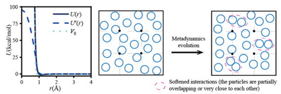 The key operation of the chemical potential calculation with the WT-Metadynamics was to set the appropriate bias potential energy Vn(s) to soften the pairwise interaction so that the particles could be close to and even overlap with each other to a certain extent (Figure 6). This approach subtly reduced the density of the system around the R* positions, increased the probability of cavitation generation, and decreased the potential energy increment of the pre-positioned particles at the R* positions, which was equivalent to achieve several successful Widom insertions. For example, the bias potential energy V0 as shown in Figure 6 (left) was used to bias the particle interaction U(r) to Ur(r) for a high-density binary Lennard–Jones (LJ) system, where r0 was an artificially specified characteristic distance between particles and the value was 0.88 times of the LJ characteristic length. The simulation system contained 640 A and 160 B particles, the simulation time was 2.5 × 105Δτ, and the result is shown in Figure 7 [22].