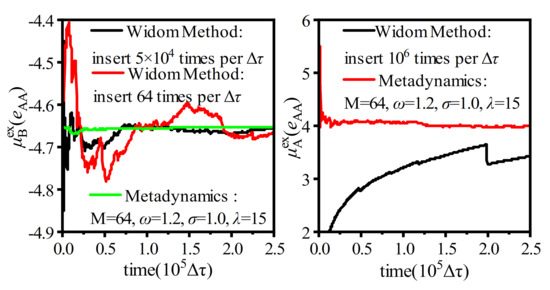 As shown in Figure 7, the convergence rate of the chemical potential calculation with the WT-Metadynamics method was much faster than that of the Widom method with two types of insertion attempts within the same simulation time. Moreover, the convergent result could be obtained by using the WT-Metadynamics method, while the conventional Widom method failed. In addition, the WT-Metadynamics method was proven to be applicable to non-uniform systems [23]. Based on the reported practices, the WT-Metadynamics method showed stronger applicability to high-density systems with complex local structures. However, the implementation of this algorithm required a reasonable selection of the bias potential function Vn(s) and relevant Gaussian function parameters. Osmair calculated the discrete free energy of the sugar chain of cellulase Cel48F-sugar in the catalytic channel by the metadynamics technique. The width of the Gaussian was 0.05 nm, and the height of Gaussian was 0.5 kJ/mol. The discrete free energies of WT-Cel48F, Q543A-Cel48F, and E542A-Cel48F were 62.1 kcal/mol, 45.9 kcal/mol, and 41.8 kcal/mol, respectively, and the errors of all free energies were 1–2 kcal/mol [46]. Bjelobrk et al. calculated the solubility of urea and naphthalene in methane cyanide, ethanol, and methanol solutions by metadynamics. The simulation and experimental results clearly showed that, in all cases, the simulation could correctly predict the order of magnitude of the solubility value. In addition, the solubility trends of urea and naphthalene in different solvents were also correctly predicted [47]. Biswas and Wonguse simulated the deprotonation kinetics of acetic acid in the bulk phase and air-water interface environment. The distance between the O-atom and H-atom of the acetic acid hydroxyl group was taken as the set variable, and the Gaussian width and height were set to 0.1 Hartree and 0.0005 Hartree, respectively. The simulated results of the deprotonation free energy of the acetic acid at the air-water interface were consistent with the existing experimental data [48]. Salvalaglio et al. calculated the free energy change of the phase transition of urea in an aqueous solution so as to observe the nucleation of urea in an aqueous solution [49]. This method had a great potential in calculating the chemical potential of the oil phase solution containing various polymer solutes in double emulsion systems.