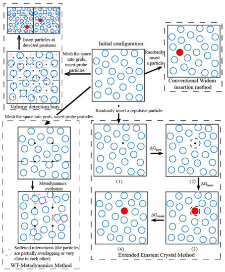 The idea of particle insertion bias was to improve the success rate of every single insertion to reduce the total number of insertion attempts. This kind of bias was mainly suitable for high-density systems with macromolecular solutes; here, the extended Einstein crystal method [24,25] and Rosenbluth sampling [26] were introduced.