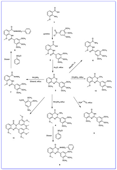 - Mohamed, M.A.; Ayyad, R.R.; Shawer, T.Z.; Alaa, A.-M.; El-Azab, A.S. Synthesis and antitumor evaluation of trimethoxyanilides based on 4 (3H)-quinazolinone scaffolds. Eur. J. Med. Chem. 2016, 112, 106–113. [Google Scholar] [CrossRef]