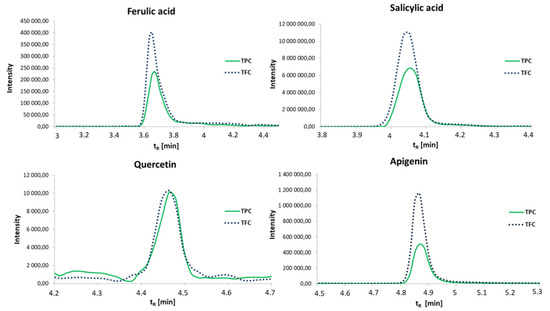 The content of individual phenolic acids and flavonoids analyzed by means of HPLC-MS/MS was correlated with the spectrophotometric results presented earlier. In our previous work, the parameters of extractions with scCO2 were successfully optimized to provide the highest total phenolics content and total flavonoids content. The optimal parameters were as follows: TPC = 353.1 K, 71.74 MPa, and 3.32 kg h−1; and TFC = 351.51 K, 78.29 MPa, and 6.72 kg h−1. In the rapid, cheap, and simple spectrometric analysis, the results obtained within the confidence interval were 21.92 mg GAE g−1 and 15.32 mg RU g−1 DM. For further comparison, a specific HPLC-MS/MS analysis was also performed for samples obtained using the optimized parameters (Table 2, Figure 3 and Figure 4). These obtained data allowed for comparing two approaches in the determination of chosen optimization criteria: general output, such as total phenolics or flavonoids content, and a more detailed one, such as the content of specific phenolic acids or flavonoids. The results are especially important from the industry point of view. Firstly, the general optimal conditions obtained as an optimization result for providing the highest amount of total flavonoids content in lucerne extract were in the same range of T > 350.15 K, P > 70 MPa, and F > 6.5 kg h−1 as obtained for eight individual compounds (coumaric, salicylic, caffeic, and syringic acids and esculetin, quercetin, naringenin, and luteolin). Secondly, the HPLC-MS/MS analysis showed that the summarized amounts of all determined compounds in extracts optimized for TPC and TFC were significant (for TPC, 258.11 µg g−1, and TFC, 347.91 µg g−1). However, in the TFC extract, there was almost 100 µg g−1 more of the determined phenolic acids and flavonoids than in the product optimized for TPC. The obtained results clearly indicate that simple total flavonoids content determination by the spectrophotometric method is more suitable for the optimization of SFE from plant material than total phenolics content. This simple and rapid method with Al2Cl3 reagent provides a great response as an optimization criterion, resulting in a high concentration of the polar bioactive constituent in the product.