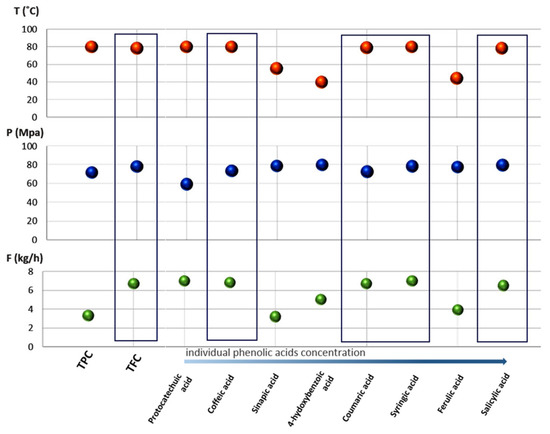 Comparison of optimal conditions of temperature, pressure, and scCO2 flow rate for TPC, TFC, and individual phenolic acids. The phenolic acids are ordered in increasing concentrations.