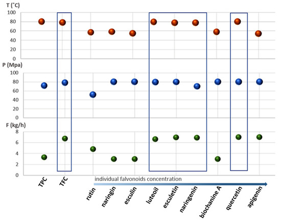 Comparison of optimal conditions of temperature, pressure, and scCO2 flow rate for TPC, TFC, and individual flavonoids. The flavonoids are ordered in order of increasing concentrations.