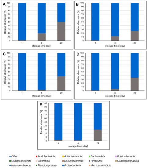 Bacterial phyla identified in pork sausages stored in MAP at 4 °C based on high-throughput sequencing of the 16S rRNA gene. The results are expressed as percentage share of each bacterial phylum in sausages. (A)—sausage with Aronia melanocarpa leaf extract; (B)—sausage with Chaenomeles superba leaf extract; (C)—sausage with Cornus mas leaf extract; (D)—sausage with curing salt containing sodium nitrate (III); (E)—control sausage with salt and spices only (without extract and nitrates (III)).