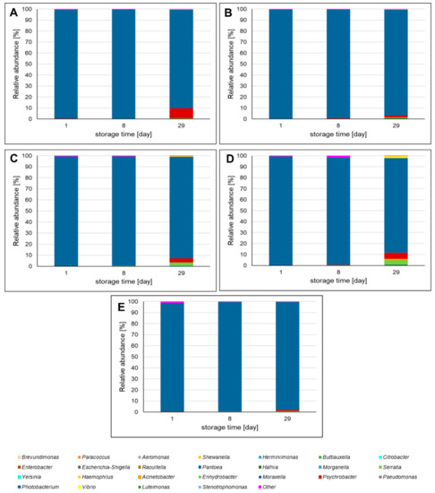 The most abundant genera among Proteobacteria phylum identified in pork sausages stored in MAP at 4 °C based on high-throughput sequencing of the 16S rRNA gene. The results are expressed as percentage share of each bacterial genius making up the total number of identified genera in each sausage sample among Proteobacteria phylum. Bacteria genera with percentage relative abundance >0.01% are shown. (A)—sausage with Aronia melanocarpa leaf extract; (B)—sausage with Chaenomeles superba leaf extract; (C)—sausage with Cornus mas leaf extract; (D)—sausage with curing salt containing sodium nitrate (III); (E)—control sausage with salt and spices only (without extract and nitrates (III)).