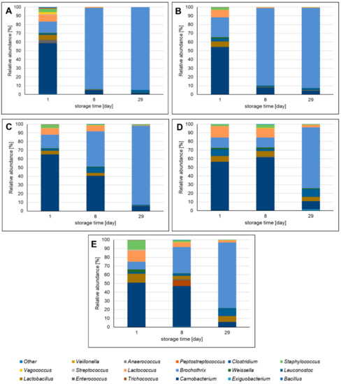 The most abundant genera among Firmicutes phylum identified in pork sausages stored in MAP at 4 °C based on high-throughput sequencing of the 16S rRNA gene. The results are expressed as the percentage share of each bacterial genius making up the total number of identified genera in each sausage sample among Firmicutes phylum. Bacteria genera with percentage relative abundance >0.01% are shown. (A)—sausage with Aronia melanocarpa leaf extract; (B)—sausage with Chaenomeles superba leaf extract; (C)—sausage with Cornus mas leaf extract; (D)—sausage with curing salt containing sodium nitrate (III); (E)—control sausage with salt and spices only (without extract and nitrates (III)).