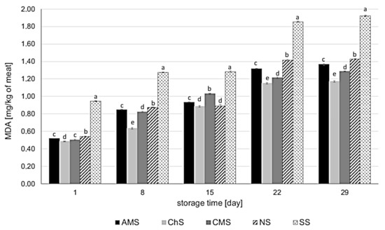 Over 29 days of storage in MAP at 4 °C for 29 days, the MDA level increased in all sausage variants (Figure 5). The A. melanocarpa, C. superba, and C. mas leaf extracts significantly inhibited lipid oxidation. The highest level of MDA was observed in the case of the SS sample. The C. superba extract showed the strongest influence on lipid oxidation, followed by the C. mas and A. melanocarpa extracts. The MDA concentration in the sausages containing leaf extracts (AMS, ChS, and CMS) was even lower than in the NS sample, indicating stronger antioxidant properties compared to sodium nitrate (III). During refrigerated storage, the greatest increase in MDA level was detected in the SS sample (by 0.98 mgMDA/kg) followed by NS (by 0.89MDA mg/kg), AMS (0.85 mgMDA/kg), CMS (0.78 mgMDA/kg), and ChS (by 0.69 mgMDA/kg). The effect of A. melanocarpa, C. superba, and C. mas leaf extracts on lipid oxidation is associated with the total phenolic content in the extracts and their antioxidant capacity, which had been determined in our previous study [24].