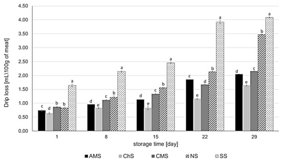 Effect of Aronia melanocarpa, Chaenomeles superba, and Cornus mas leaf extracts on drip loss in pork sausages stored in MAP at 4 °C. The results are expressed as mean ± SD. a, b, c, d, e—statistically significant differences between the variants of sausages (p < 0.05); AMS—sausage with Aronia melanocarpa leaf extract (5% v/w); ChS—sausage with Chaenomeles superba leaf extract (5% v/w); CMS—sausage with Cornus mas leaf extract (5% v/w); NS—sausage with curing salt containing sodium nitrate (III); SS—control sausage with salt and spices only (without extract and nitrates (III)).