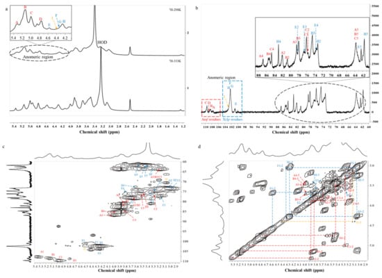 NMR spectroscopy is one of the most essential and useful techniques for the structural identification of polysaccharides, including 1D NMR (1H and 13C NMR) and 2D NMR (COSY, TOCSY, NOESY, HSQC, and HMBC NMR). The 1H NMR spectrum (Figure 2a) of HBAX-60 was collected at 303 K, and signals were assigned by referring to previous data and methylation results. Nine explicit sugar residues are labelled in Figure 2a. The chemical shifts of anomeric protons in α-configuration ranged from 4.7 to 5.5 ppm, while the resonances observed at 4.2–4.7 ppm were derived from β-anomeric protons []. As the negative peaks were overlapped by an HOD peak at 3.39–3.59 ppm, another 1H NMR test (Figure 2a) was carried out at 333 K.
