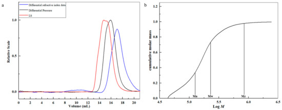 The Mw distribution, radius of gyration, and [η] of HBAX-60 were quantified by high performance size exclusion chromatography (HPSEC) coupled with the three online detectors, as previously reported []. A Series 1500 pump (Scientific Systems Inc., Janesville, WI, USA) and two columns—SB-806 HQ column (8 × 300 mm) and SB-804 HQ column (8 × 300 mm, Showa Denko Inc., Tokyo, Japan)—in series were equipped in the HPSEC system, to which an SB-G guard column (6 × 50 mm) was connected. The eluent was a 0.1M NaNO3 solution (containing 0.02% NaN3) with a flow rate of 0.6 mL/min, while the columns were maintained at 35.0 ± 0.5 °C. HBAX-60 was injected after passing through a 0.22 μm hydrophilic membrane. All parameters were processed and analyzed using the ASTRA 6.1.7 software (Wyatt Technology Corporation, Santa Barbara, CA, USA). A refractive index increment (dn/dc) of 0.146 mL/g was used in the calculation.