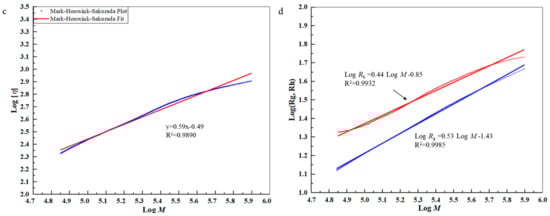 The intrinsic viscosity ([η]), root mean square (Rg), and average hydrodynamic radius (Rh) are important parameters that can be applied to explore the solution properties of a polymer chain. According to the equation of Mark–Houwink–Sakurada (MHS) ([η] = KMα), the relationship of [η] (619.7 mL/g) and molecular mass could be associated with the “stiffness” of HBAX-60 []. The double logarithmic plots of Mw versus [η] showed a decreased slope (Figure 4c), revealing the presence of the enhancement of intermolecular interactions in the high Mw fraction. A major plot accounting for 84.0% of the total molecular mass was used to fit the curves to reflect more specific molecular properties. The value of α in the region was 0.59, which probably exhibited a random coil conformation in 0.1 mol/L NaNO3 solution []. The particle size distribution and aggregation state affected the viscosity of the solution and the structural network of the gel, as well as the functional properties of arabinoxylan. Through using linear regression (Figure 4d), the slope of Log Rg vs. Log Mw was found to be 0.44 and the slope of Log Rh vs. Log Mw was found to be 0.53, suggesting the presence of linear flexible polymer chains in aqueous solution []. Moreover, with the decrease of Mw, the value of Rg and Rh decreased, which indicated that HBAX-60 had a better ductility in the 0.1 mol/L NaNO3 solution.