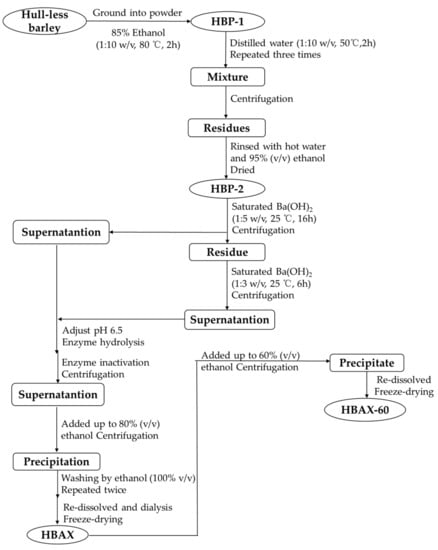 As shown in Figure 5, the whole hull-less barley grains were ground into powder (not sieved), which was then refluxed by 85% (v/v) ethanol for 2 h to remove oligosaccharides, volatile oil, and other small molecules []. The residue was separated and eventually dried to get a hull-less barley precipitate (HBP-1). Because arabinoxylan usually occurs together with β-glucan in cereal cell walls [], HBP-1 was treated with hot water (1:10 w/v) three times to avoid the influence of β-glucan, followed by centrifugation to separate the residue (named as HBP-2) from the supernatant. Dried HBP-2 was extracted from a saturated barium hydroxide solution with constant stirring at 25 °C []. The extraction process was repeated twice. After centrifugation (5000 rpm for 15 min), the pH of the obtained supernatant was adjusted to be 6.5 with 2 mol/L HCl. Then, the supernatant was hydrolyzed by enzymes to successively remove starches and proteins, including α-amylase (95 °C for 3 h), amyloglucosidase (60 °C for 30 min), and papin (60 °C for 1 h). The enzymes were inactivated at 100 °C for 10 min and then centrifugated (5000 rpm for 15 min). The supernatant was concentrated, followed by an ethanol precipitation until a final concentration of 80% (v/v). The freeze-dried hull-less barley arabinoxylan (HBAX) was collected.