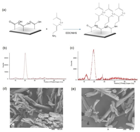 The incorporation of the geranyl groups to the support was confirmed by X-ray diffraction (XRD) (Figure 2b,c).