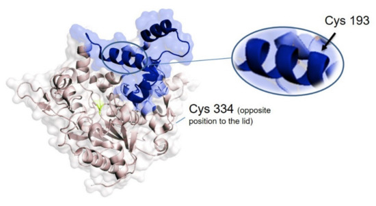 In order to perform that, genetically and chemically enzymes with SH were prepared. In the former case, thermophilic lipase from Geobacillus thermocatenulatus (GTL) (formerly called Bacillus thermocatenulatus lipase BTL2) was genetically engineered to produce two different variants containing a unique cysteine in a specific position, GTLC193, with the cysteine in the oligopeptide lid, and GTLC334, with the cysteine located in the opposite site of the active site (Figure 3) [33].