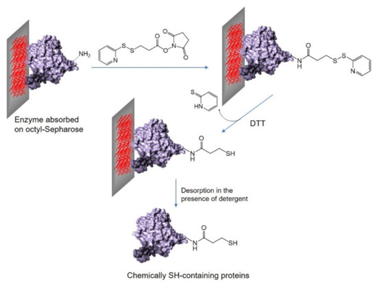 In order to extend the strategy, a chemical incorporation of the SH group to the protein surface was attempted (Figure 4). For that, succinimidyl 3-(2-pyridyldithio)propionate (SPDP) was used to perform a direct modification of the N-terminus of the protein. For this study, two different enzymes were modified, Rhizomucor miehei lipase (RML) and β-galactosidase from E. coli (β-Gal). This modification process was performed on solid phase; both enzymes were previously absorbed on octyl-Sepharose (Table S1). Then, the solution of SPDP was added at pH 7.3. In order to obtain a free SH on the protein, a DTT treatment was used (Figure 4). Finally, the chemical modified RML_SH and B-Gal_SH were recovered in solution by adding a detergent.