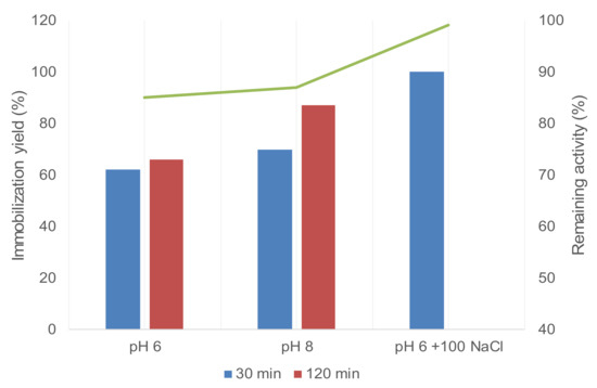 The best results were obtained at pH 8 after 2 h incubation with 87% immobilization, whereas at pH 6, the value was around 70% (Figure 6). In both cases, the lipase-retained activity on the solid was higher than 80%. Surprisingly, a faster immobilization procedure was observed at pH 6 in the presence of NaCl, where complete immobilization was observed after 30 min incubation, with almost full activity conserved (Figure 6).