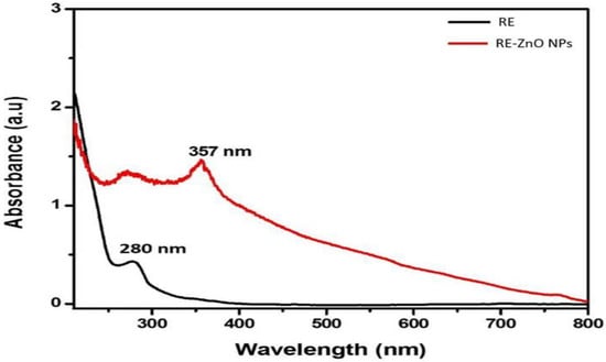 Figure 1 displays the UVs absorption spectrum of the RE and RE-ZnO NPs. A peak was observed at 280 nm, which could be attributed to the n–π* transition of the molecules present in the RE. The spectrum of RE-ZnO NPs revealed a peak at 357 nm due to intrinsic bandgap absorption, which confirms the RE-ZnO NPs synthesis. The bandgap energy was calculated at 3.47 eV [33,34].