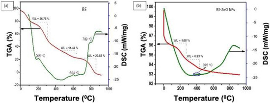 Figure 3a,b describe the TGA/DSC spectra of the RE and RE-ZnO NPs, which displayed heat at 10 °C/Min. TGA was used to decompose the prepared materials, and release water and volatile organic molecules [35,36]. The extract gives three types of weight loss of 26.78%, 11.44%, and 20.88% with corresponding temperatures of 205 °C, 604 °C, and 789 °C, respectively. The weight loss of the extract at 26.78% is due to the removal of water molecules [37]. The weight loss of 11.44% might be due to the decomposition of hydroxide and volatile organic groups [38]. The TGA/DSC spectrum of RE-ZnO NPs is shown in Figure 3b. The DSC curve of RE-ZnO NPs exhibited exothermic and endothermic peaks at 95 °C and 395 °C, respectively. The exothermic peak revealed weight loss (1.68%), which is due to the removal of water and organic volatile molecules from the RE-ZnO NPs. The endothermic peak at 395 °C reveals the decomposition of zinc hydroxide to ZnO NPs with the weight loss (0.93%), as shown in Figure 3b.