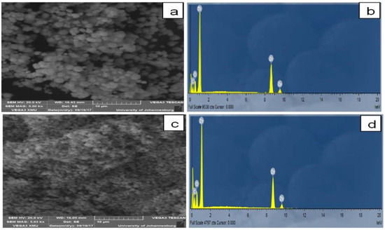 SEM images of RE-zinc oxide nanoparticles (RE-ZnO NPs). (a) RE-ZnO NPs; (b) Spectrum of RE-ZnO NPs; (c) ZnO alone; (d) Spectrum of ZnO alone.