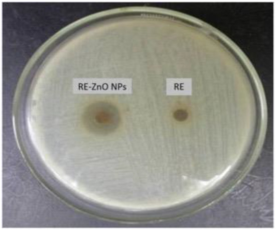 The agar well diffusion technique was used to find the antibacterial activity of RE-ZnO NPs using S. aureus (ATCC® BAA-1026TM). Briefly, a sterile cotton swab was dipped into a broth culture of S. aureus (1 × 105 cfu/mL) and spread uniformly on nutrient agar plates. Two agar wells of 5 mm diameter were prepared with the help of a sterilized stainless steel cork borer. About 100 µL of RE-ZnO NPs or RE were added to wells and the plates were incubated at 37 °C for 24 h. Then the zones of inhibition (appearance of clear area/white color area around the wells) and the diameter of each zone of inhibition were measured and the mean values were recorded.