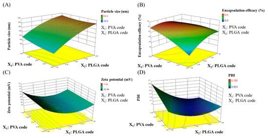 | X1: PVA (%) | X2: PLGA (mg) | Y1: Particle Size (nm) | Y2: EE 1 (%) | Y3: Zeta Potential (mV) | Y4: PDI 2 | |