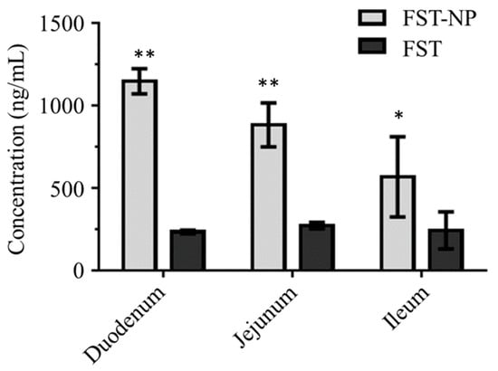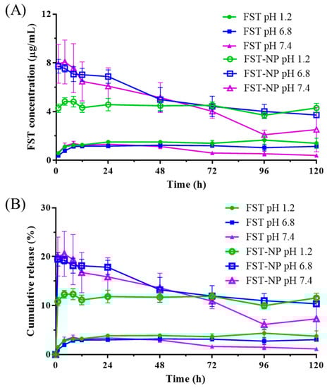 | C72 h 1 (μg/mL) | K 2 (h−1) | t1/2 3 of FST (h) | t1/2 of FST–NP (h) | |