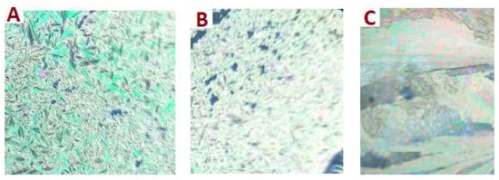 Optical photomicrographs under polarized optical microscopy (POM) of the compound 2c during the cooling scan. (A) Smectic-A mesophase at 267 °C, (B) Smectic-C mesophase at 220 °C and (C) Crystal phase at 90 °C.