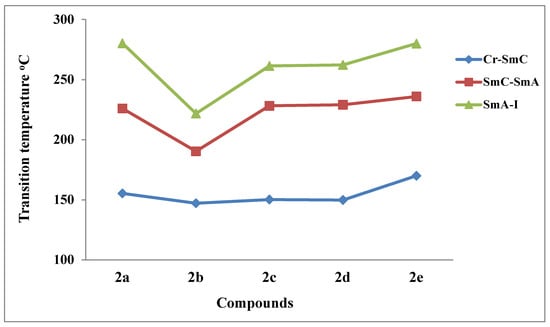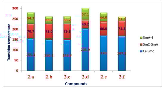 Moreover, it is clear from Figure 7 that the SmC mesophase range of the alkyl derivative 2a (C = 12) is longer than that of the alkoxy derivative of the same length (2e). However, the trend is reversed in case of the SmA mesophase range. This could be attributed to the value of the dipole moment of the compounds. The polar alkoxy group enhances a dipole moment higher than that of the alkyl one. The higher dipole moment increases terminal with respect to the parallel interaction, such competitive interactions enhances one phase rather than the other.