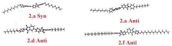 Figure 5 emphasizes that the syn isomer is less planar than the anti-one of the same alkyl chain length. Moreover, the alkoxy derivative is more planar than that of the alkyl derivative and this could be attributed to the planar conjugation of the mesomeric RO group with respect to the hyperconjugated R one. It is worth mentioning here that since the calculated molecular geometries in the gaseous state, the presence of the liquid crystalline compounds in the condensed mesophases, the lowest energy may be different and the more elongated species are preferred [].
