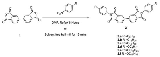 In addition, this work aims to prepare a series of high temperature alkyl and alkoxy biphenyltetracarboxydiimide liquid crystals. Complete investigations of thermal optical properties will also be another aim of this paper. Finally, continuing our interest [,,,,,,] in conducting the experimental results with density functional theory (DFT) theoretical calculations is another goal. In addition, the pursuit of our interest [,,,,,] as well as other researchers [,,,,,,] in finding a facile, efficient and green method for preparation of nitrogen heterocycles, herein, another aim of this work is to investigate as a comparative study of use of the solvent-free synthesis of 3,3′,4,4′-Biphenyltetracarboxy-N,N′-bis-(alkyl or alkoxyphenyl)diimide, 2a–2f using the mechanochemical approach using our previous method [].