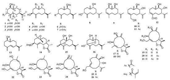 Germacrane-type sesquiterpenoids are monocyclic sesquiterpenoids, which are composed of a 10-membered carbon ring, a methyl group at C-4 and C-10, and an isopropyl group at C-7. Twenty-six compounds of this type have so far been reported from the genus. Compounds 1–13, 15, and 16 vary in the position and orientation of the oxygen-containing substituents. Compounds 14 and 17–24 form five-membered γ-lactone ring at C-6 and C-12. Compounds 25 and 26 form irregular rings due to the configuration of double bond in the ring. Examples of structures are shown in Figure 1.