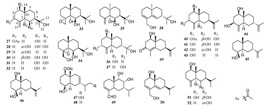 Eudesmane-type sesquiterpenoids are bicyclic compounds, composed of two six-membered carbon rings with methyl groups at C-4 and C-10 positions, and an isopropyl group at C-7. Twenty-six compounds with this skeleton have been isolated from this genus, however, no eudesmanolides have been reported so far. Compounds 35 and 38 are rare due to α-CH3 at C-10, others having a β-CH3 at the same position. Examples of structures are shown in Figure 2.