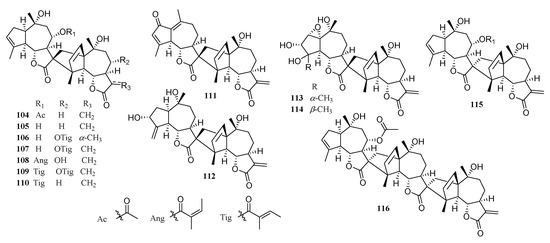 Guaianolide-type sesquiterpenoids have ternary rings consisting of a five-membered ring, a seven-membered ring, a five-membered γ-lactone ring, and methyl groups at C-4 and C-10 positions. The structures are quite complicated with up to nine stereocenters, mostly highly oxidized. Moreover, they are also the most abundant compounds in the Chrysanthemum genus. Compound 90 contains chlorine atoms. So far, 60 chlorine-containing guaianolide-type sesquiterpenoids have been isolated from Compositae [39,46,47]. Examples of structures are given in Figure 3.