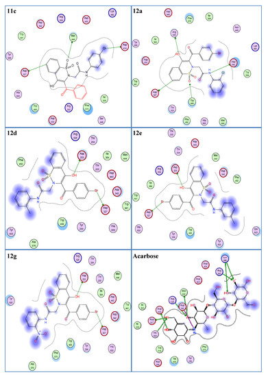 Two-dimensional interaction modes of the most active compounds (11c, 12a, 12d, 12e, 12g) and the standard drug, acarbose. Blue color indicates ligand exposure and a green color dotted line indicates the interactions of receptor enzymes with ligands.