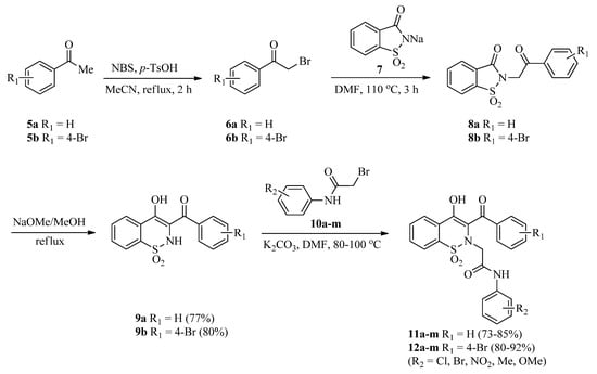 Synthesis of 1,2-benzothiazine-N-arylacetamides 11a–m and 12a–m.