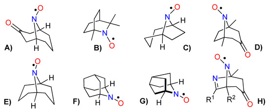 Selected examples of known BNRs: (A) Norpseudopelleterine N-oxyl [32]; (B) trimethylisoquinuclidine N-oxyl [33]; (C) nortropane N-oxyl [34]; (D) dimethylnortropinone N-oxyl [35]; (E) 9-azabicyclo[3.3.1]nonane N-oxyl (ABNO) [36]; (F) 2-azaadamantane N-oxyl (AZADO) [37]; and (G) 9-azanoradamantane N-oxyl (nor-AZADO) [38]. (H) The BNRs obtained in this work.